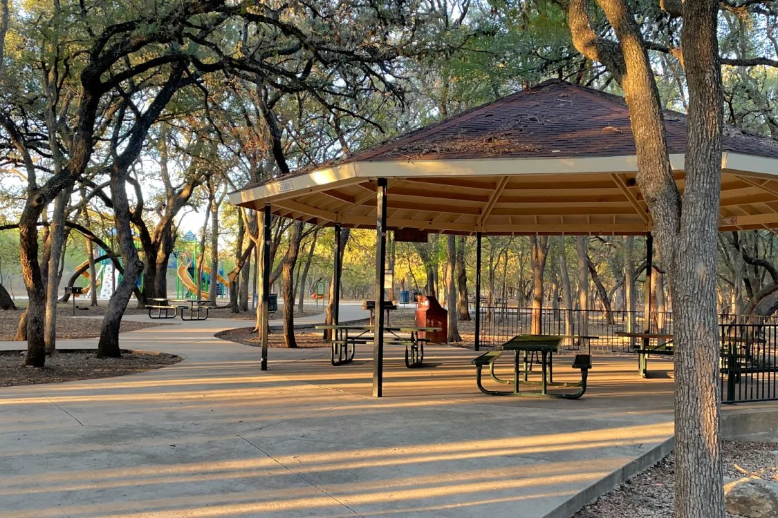 The Al Becken Pavilion is located in a quiet, wooded area of McAllister Park. It is a popular hub for runners and mountain bikers as it features easy access to several paved and natural trail systems in the park. Parking is immediately adjacent to the pavilion.